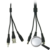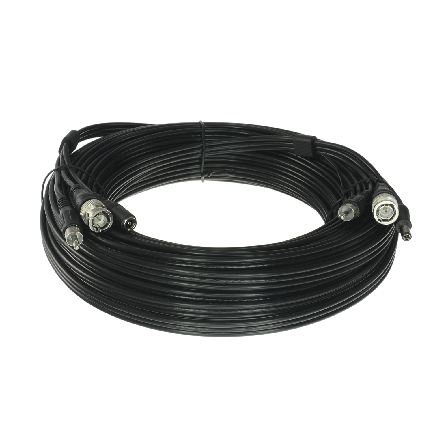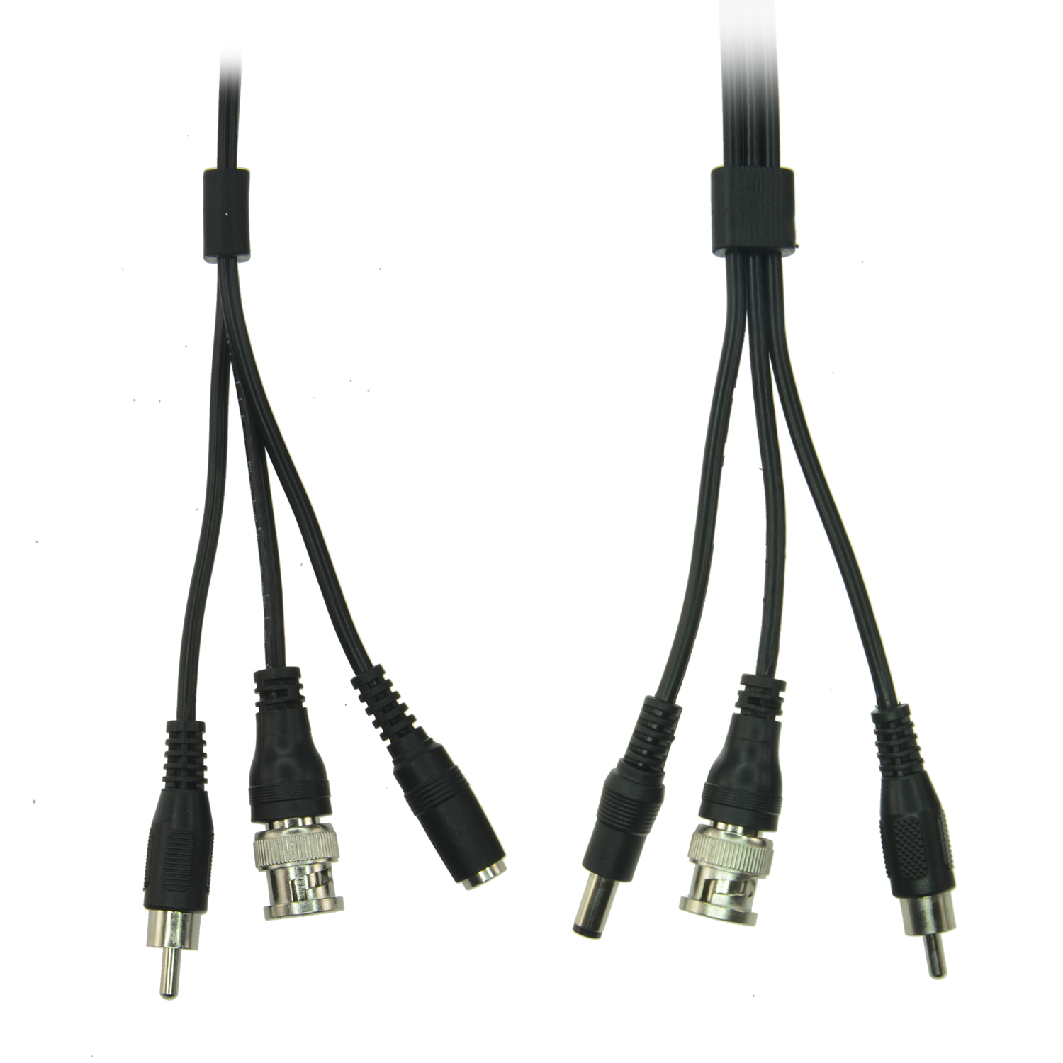 Cabo combinado mini RG59, com cabo de áudio para linha, mais um cabo para a alimentação DC. Formato plano para reduzir o diâmetro do conjunto e facilitar a instalação. Mínima perda. Comprimento fixo de 20 metros, com conector macho-macho BNC (vídeo), macho-macho RCA (áudio) e fêmea-macho Jack (alimentação) nas extremidades.