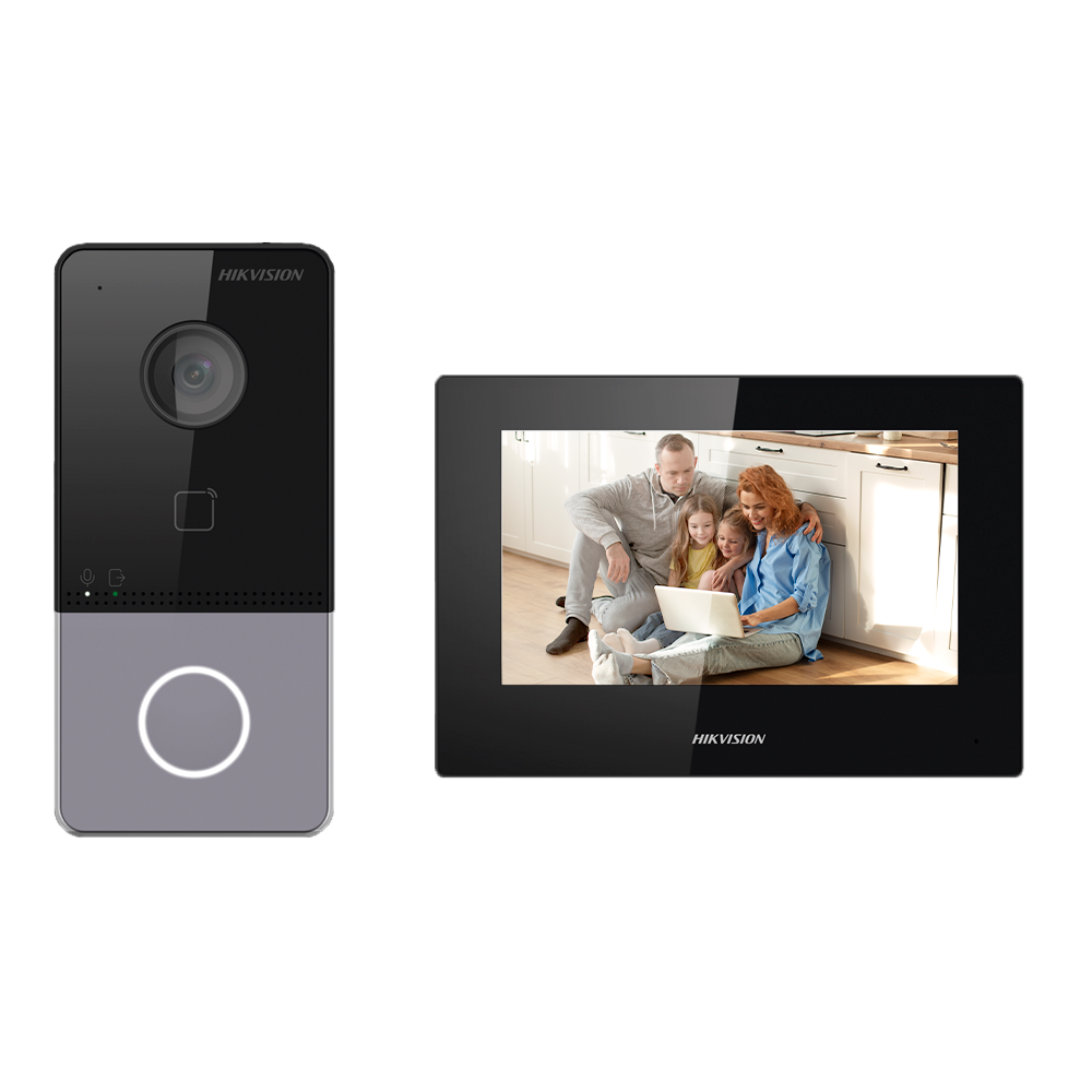 - Kit formado por: DS-KV6113-WPE1(C) painel de entrada de vídeo de superfície exterior com 2 câmara Mpx HD e DS-KH6320-LE1(B) monitor interior com 7″ ecrã LCD TFT