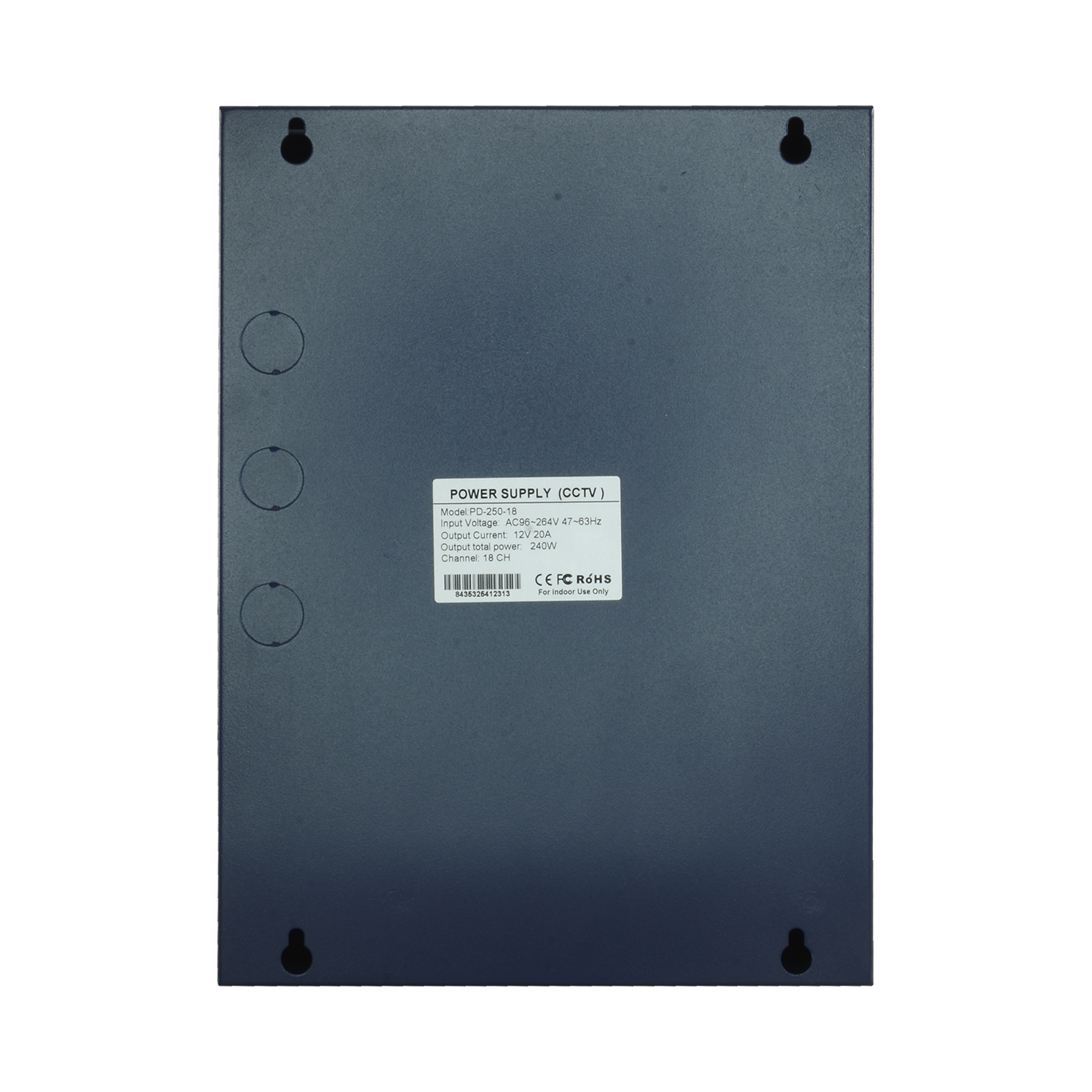 Proporciona uma potência total de 250 W (20 A) que se repartem de modo uniforme entre 18 saídas de tensão contínua DC 12 V com conexão por borne. A fonte é alimentada através de uma ficha de corrente alternada (AC 110 ~ 220 V).