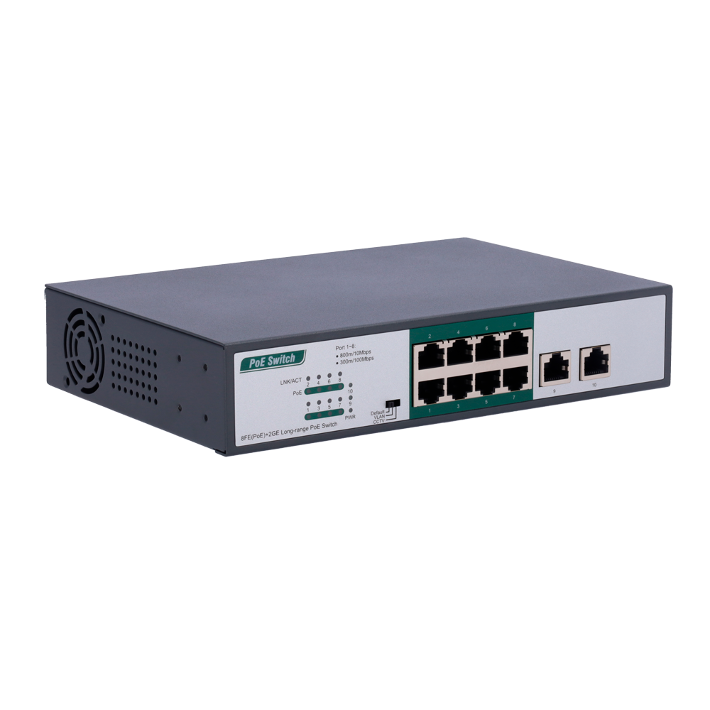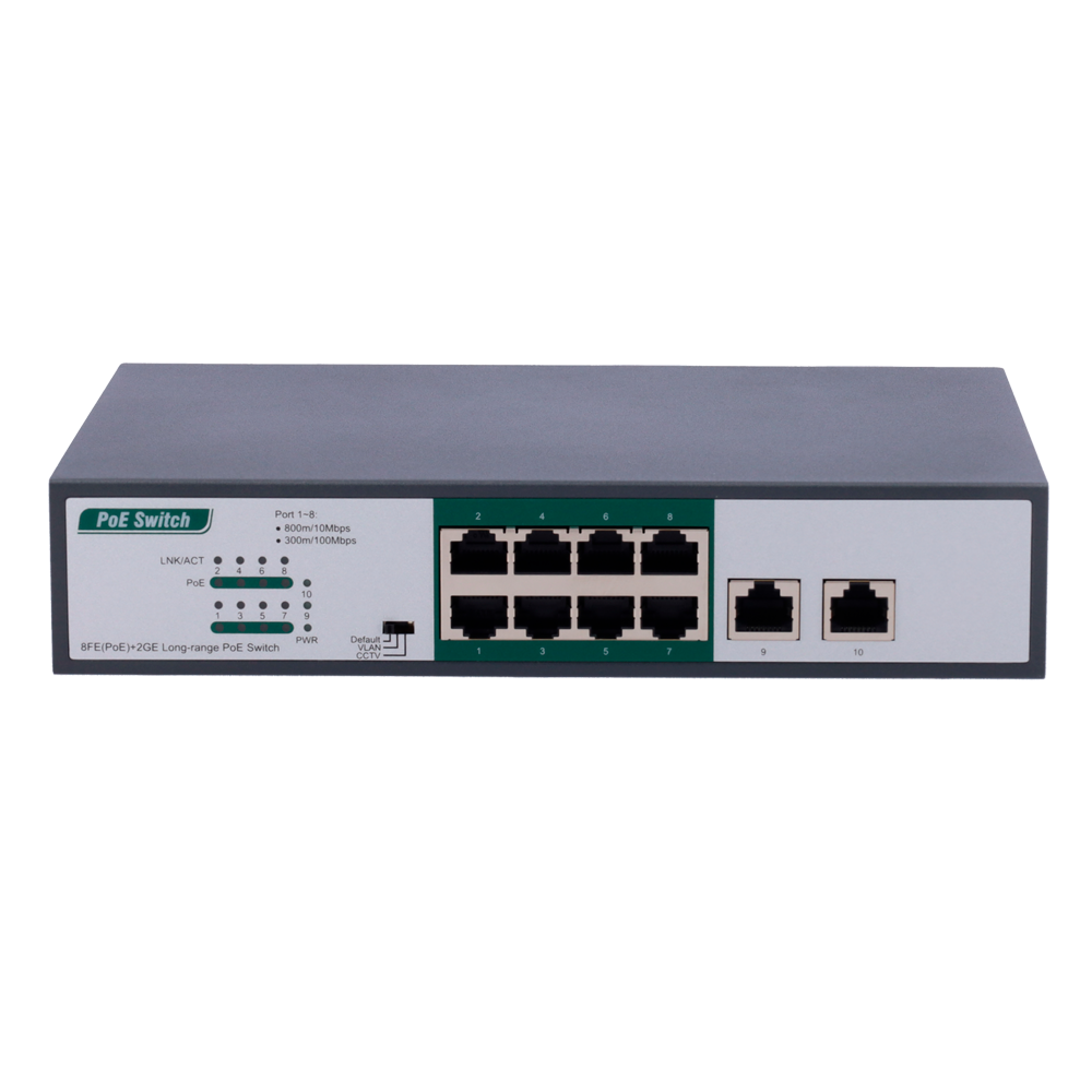 - As portas 1~8 são portas PoE de longo alcance e permitem até 300 metros a 100Mbps e 800 metros a 10Mbps